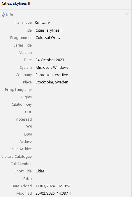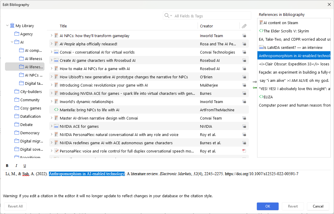 And even if you don’t care about your own time and effort to this end, think of the poor copyeditors and proofreaders. I do a lot of voluntary work of that kind, mostly for Eludamos. By far, bar none, without a doubt, easily the biggest timesink and general frustration of the task of preparing an article for publication is fixing references. It can easily take several hours to fix a reference list that makes a habit of missing or incorrect information. If you’re an author I’m copyediting whose manuscript has a pristine bibliographies, I genuinely think more highly of you as a person. That’s how much of a favour it feels to have this stuff down. And if this sounds patronising, I can tell you from experience that the vast majority of you do not have this stuff down.