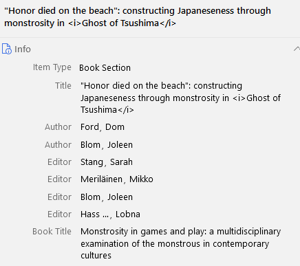 Ford, Dom, and Joleen Blom. 2025. ‘“Honor Died on the Beach”: Constructing Japaneseness through Monstrosity in Ghost of Tsushima’. In Monstrosity in Games and Play: A Multidisciplinary Examination of the Monstrous in Contemporary Cultures, edited by Sarah Stang, Mikko Meriläinen, Joleen Blom, and Lobna Hassan. Amsterdam University Press. https://doi.org/10.5117/9789463725682_ch01.