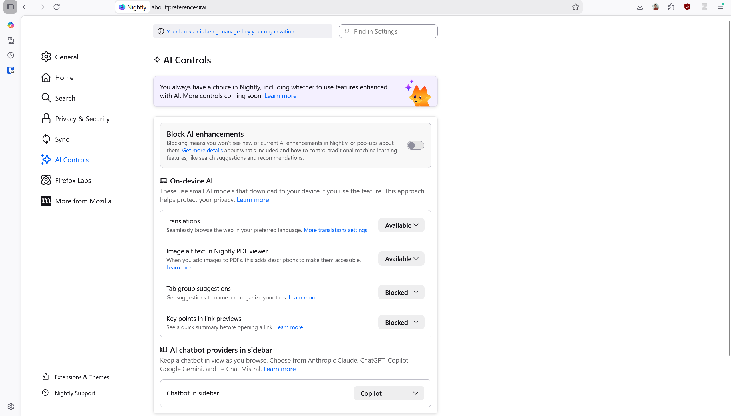 I also like Firefox’s approach to AI integration. Rather than forcing it into everything, AI features are clearly marked and described, with both granular and sweeping options to enable or block them. Features can be set to Available, Enabled or Blocked. Blocked is pretty clear, but even after reading the description I’m not entirely sure what the difference between Available and Enabled is. Still, I like this approach.